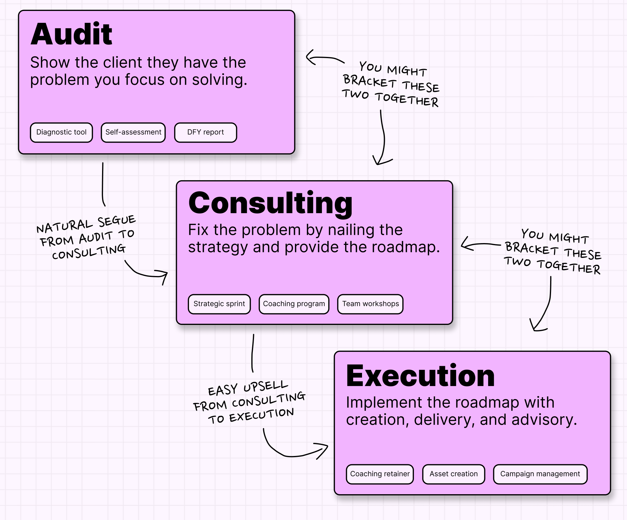 Consulting + Execution — If your focus is on delivery of assets, then you might kick things off with some strategy work to make sure those assets are right. This is a good way of adding value to what would otherwise be seen as just some delivery work.
