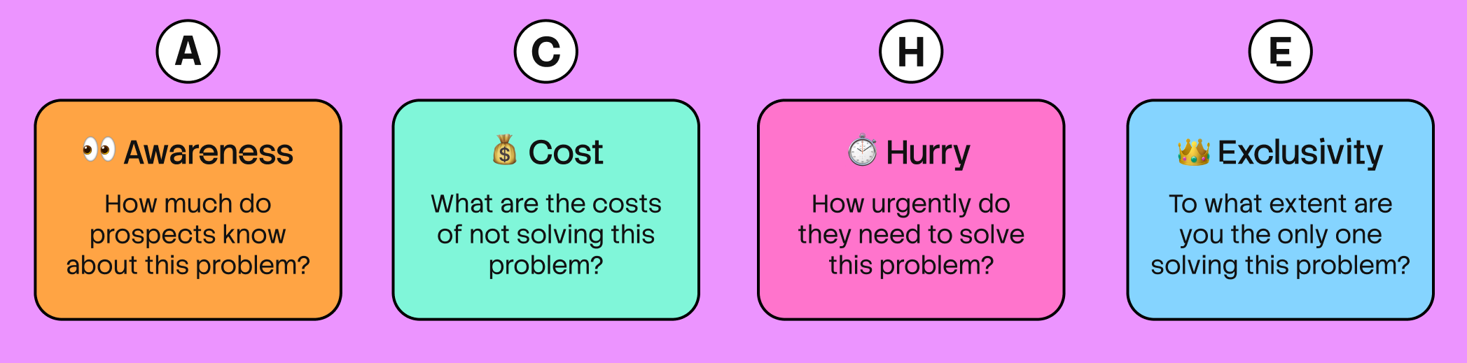 This goes hand-in-hand with the cost criteria. Except this time it’s about, well, time. The most valuable problems also tend to be the most urgent. Because if a problem doesn’t need to be urgently solved, then it’s not a priority. And so your client’s budget ends up getting spent elsewhere.