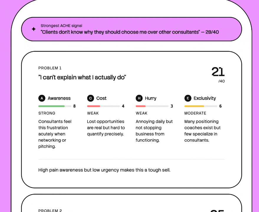You can just try to objectively score each problem using my framework. But it can be hard to do this without being biased or assuming. My job when I do this with clients is to be the voice of the buyer and try to provide a more objective perspective.