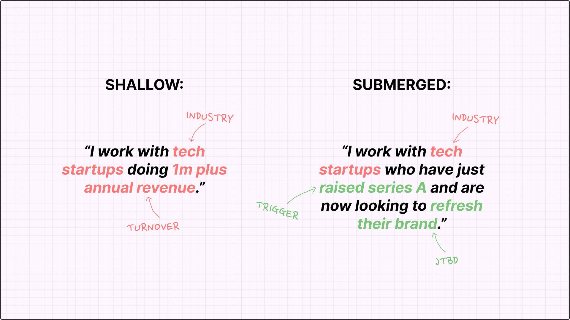 But if you pick a JTBD as your focus, then that might exist across industries, across company sizes, across locations. You’re focusing but without needlessly narrowing. Of course, after you pick some submerged attributes, you can still use shallow ones to pad out your ICP if you actually want that focus. But you aren’t constrained by it in the same way.